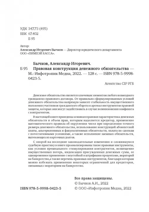 Если вы обнаружили ошибку в описании товара «Правовая конструкция денежного обязательства» (авторы: Бычков Александр Игоревич), то выделите её мышкой и нажмите Ctrl+Enter. Спасибо, что помогаете нам стать лучше!