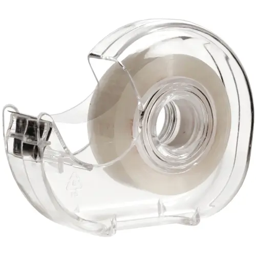 Прозрачная клейкая лента в пластиковом диспенсере.