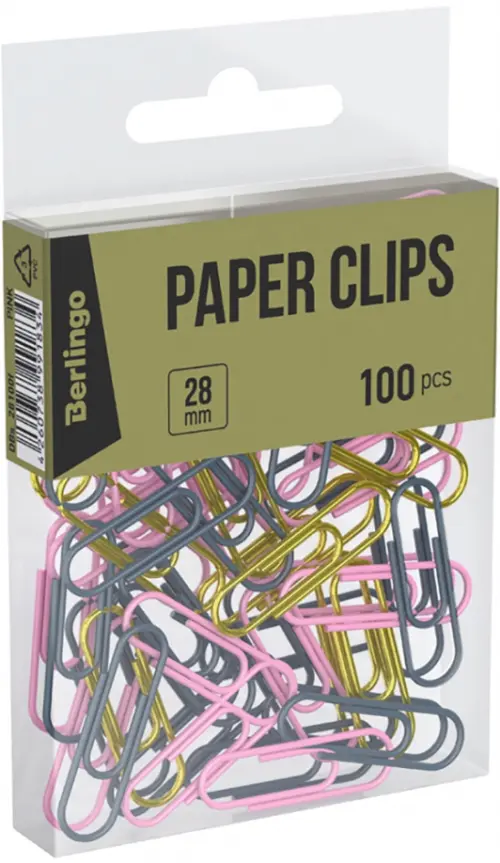Оригинальные металлические канцелярские скрепки Berlingo с цветным виниловым покрытием и золотым напылением. Не ржавеют, не пачкают бумагу, обеспечивают надежное скрепление.