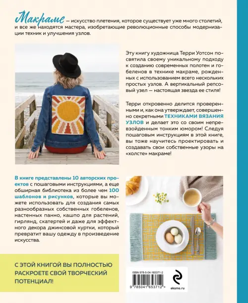 Но макраме автора этой книги художника Терри Уотсон совсем другое и, наверное, больше всего походит на яркий гобелен. Да и используется гораздо шире — как вам, например, роскошное плетеное солнце на спине джинсовой куртки? Любая картина в технике макраме, да еще с использованием минимального количества простых узлов — это настоящая трендовая революция в мире рукоделия!