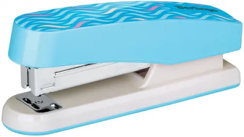 Степлер отличается от других моделей необычным дизайном с рисунком, напечатанным на верхней крышке корпуса и нежными пастельными цветами. У данной модели пластиковый корпус и полностью металлический механизм. Корпус выполнен в сочетании белого и голубого пастельного цветов с необычным рисунком. Упакован в блистер с европодвесом.
