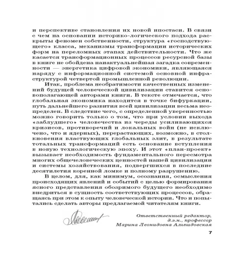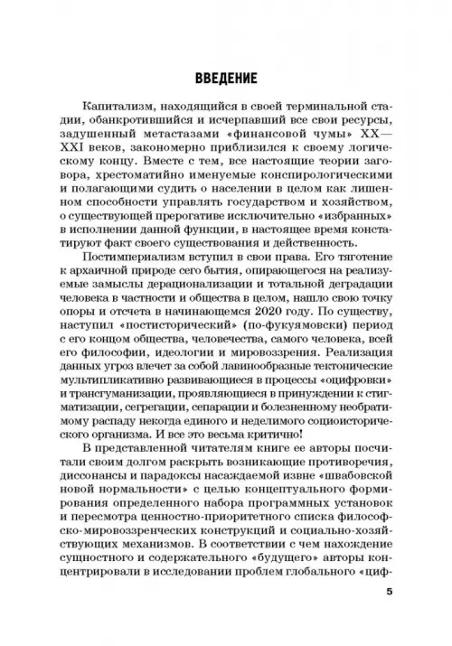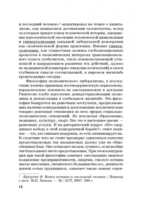 Конец человеческой истории с точки зрения Ф. Фукуямы и его соратников и последователей наступает в связи с полной и окончательной победой капитализма на всем земном шаре. Капитализм как система действительно «обанкротился». Он исчерпал все свои ресурсы, и дальнейшее экономическое и социальное развитие абсолютно исключено. Метастазы финансовой чумы ХХ—ХХI вв. разрослись в глобальный мировой кризис человеческой цивилизации как таковой. Объективные экономические интересы глобально господствующей элиты, в настоящее время овладевшей и политически, и экономически, и ментально всем остальным миром, не без диктата практически реализованы и удовлетворены. «Золотой миллиард» закрепил свое привилегированное положение. Тем не менее, возникающие противоречия, диссонанс и парадоксы навязываемой «новой нормальности» (ненормальности) требуют в настоящее время выработки определенного набора программных установок и пересмотра ценностно-приоритетного списка философско-мировоззренческих конструкций и социально-экономических механизмов ресурсов, технологий и общества в целом с целью нахождения сущностного, глубокого и содержательного «завтра». Монография рекомендуется студентам, аспирантам, научным работникам, преподавателям и всем интересующимся актуальными проблемами современной определяющейся истории человечества.