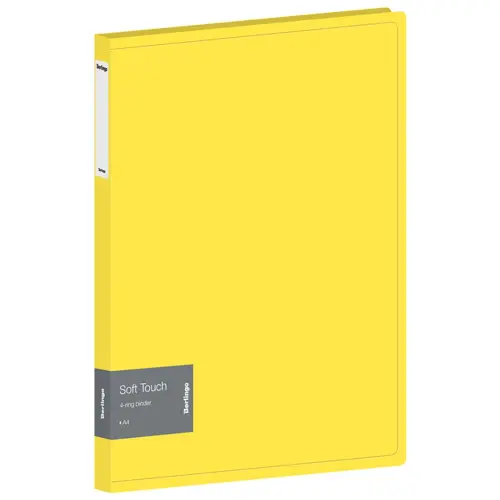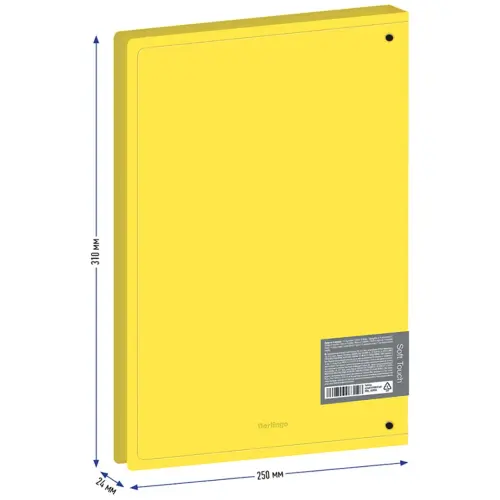 Папка на 4-х D-кольцах Berlingo серии Soft Touch формата А4 - стильный аксессуар для офиса и учёбы с плотной обложкой с приятной софт-тач фактурой. Изготовлена из высококачественного полипропилена толщиной 700 мкм с особой фактурой с эффектом софт-тач. Ширина корешка составляет 24 мм. Ширина папки составляет 250мм. Папка оснащена стильными черными кольцами, которые крепятся на заднюю стенку. Специальная D-форма колец диаметром 20 мм помогает удобно и ровно хранить документы, которые могут быть выровнены по левому краю, благодаря боковой вертикальной стенке кольца. Вместимость папки – 150 листов. На внутренней стороне обложки папка оснащена плотным прозрачным карманом для удобного хранения мелочей: ручки, заметок, визиток, дисков, флешек и др. Корешок папки оклеен специальным стикером для подписи содержимого, что позволяет легко и удобно организовывать документы на полке. Размер папки составляет 310*250*24 мм. Упакована в индивидуальный прозрачный пакет по форме. Папка оснащена съемным стикером с выходной информацией и штрих-кодом.