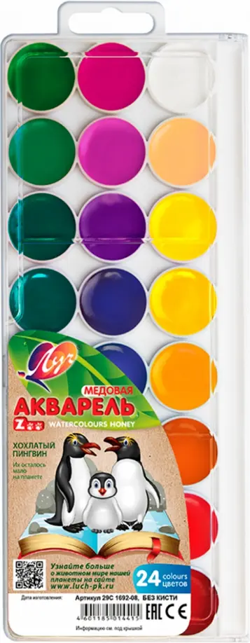 Высококачественная краска для детского творчества с яркими и чистыми цветами, изготовленная по классической рецептуре с использованием мёда. Прекрасно размывается и разносится по поверхности бумаги. Краски смешиваются между собой, сохраняя насыщенность цвета. Акварель легко смывается с рук и одежды.