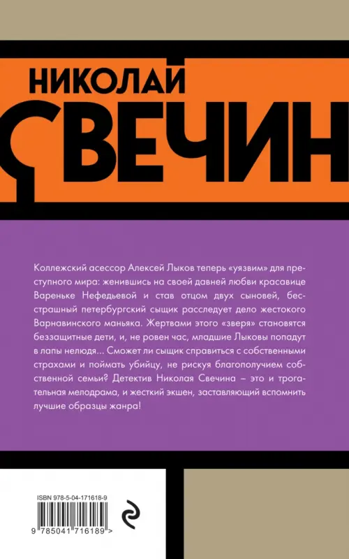 Коллежский асессор Алексей Лыков теперь "уязвим" для преступного мира: женившись на своей давней любви красавице Вареньке Нефедьевой и став отцом двух сыновей, бесстрашный петербургский сыщик расследует дело жестокого Варнавинского маньяка. Жертвами этого "зверя" становятся беззащитные дети, и, неровен час, младшие Лыковы попадут в лапы нелюдя… Сможет ли сыщик справиться с собственными страхами и поймать убийцу, не рискуя благополучием собственной семьи? Детектив Николая Свечина – это и трогательная мелодрама, и жесткий экшн, заставляющий вспомнить лучшие образцы жанра!