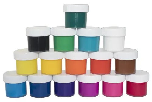 В наборе 16 цветов в пластиковых баночках объемом 20 мл с отвинчивающейся крышечкой: белая, желтая, алая, голубая, изумрудная, черная, коричневая, рубиновая, сиреневая, оранжевая, зеленая светлая, фиолетовая, лимонная, розовая, лазурно-голубая, бирюзовая.