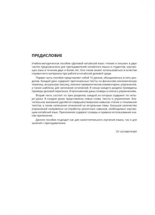 Учебно-методическое пособие "Деловой китайский язык: чтение и письмо" в двух частях предназначено для преподавателей китайского языка и студентов, изучающих язык в течение двух и более лет. Оно также может использоваться в качестве справочного материала при работе в китайской деловой среде.