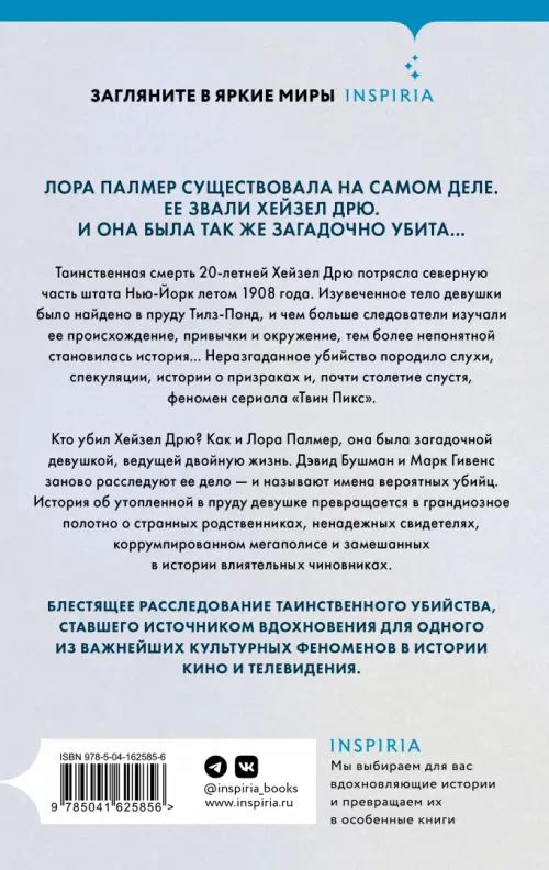 Кто убил двадцатилетнюю Хейзел Дрю и оставил ее тело в пруду на севере штата Нью-Йорк в 1908 году? В этом остросюжетном криминальном романе Бушман и Гивенс расследуют убийство, которое вдохновило на создание культового телесериала "Твин Пикс". Авторы эффективно обобщают пять лет исследований, используя ряд источников, и рисуют убедительную картину событий, которая заставляет читателей чувствовать, что они наблюдают за событиями в реальном времени.