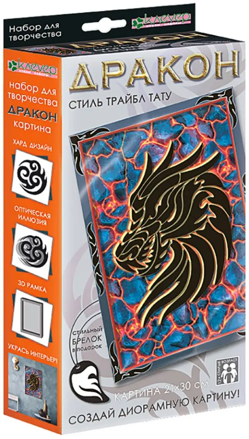 Набор «Дракон. Трайбл тату» разработан для создания оригинальной диорамной картины с хард-дизайном в стиле Трайбл тату. Основой для картины служат фэнтезийный фон с яркими контурами и броская 3D рамка, а детали из чёрной самоклейки сложатся на прозрачном пластике в мифического дракона - благодаря двухуровневому расположению изображений картина приобретает эффект оптической иллюзии.