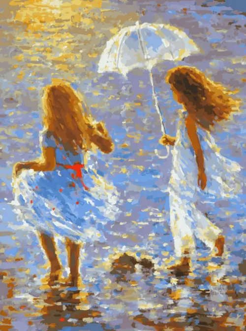Елена Калашникова изобразила двух прогуливающихся девочек на фоне поблескивающего моря.