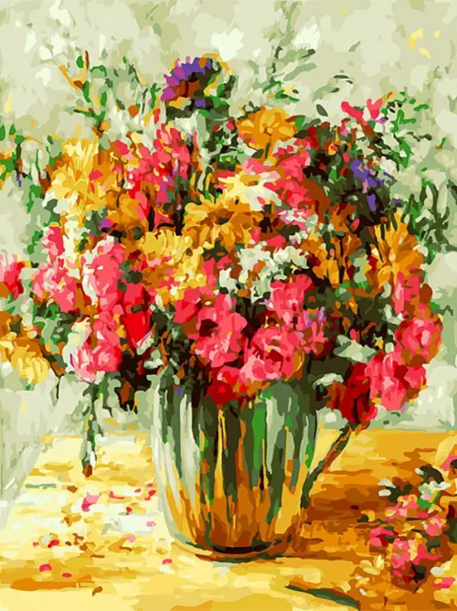 В наборе есть всё для создания прекрасной цветочной картины в формате 30*40 см. Акриловые краски на водной основе расфасованы в маленькие баночки с номерами, каждый номер соответствует номеру на холсте. Холст на подрамнике изготовлен из 100% хлопка и натянут на деревянный подрамник. Для подрамника использована хорошо просушенная древесина сосны.