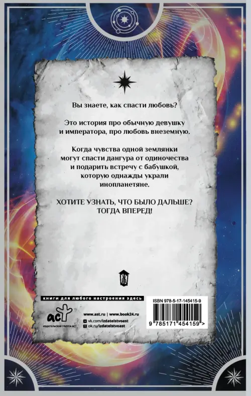 Это история про обычную девушку и императора, про любовь внеземную. Когда чувства одной землянки, могут спасти дангура от одиночества и подарить встречу с бабушкой, которую однажды украли инопланетяне.