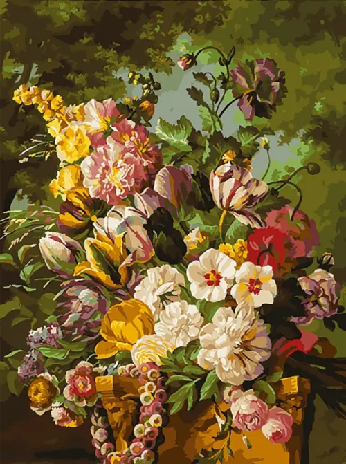 В комплекте холст, натянутый на деревянный подрамник, на холсте контурами обозначены области для раскрашивания, внутри областей цифрой отмечен номер необходимой краски. Так же в комплект набора для раскрашивания входит контрольный лист, по которому вы всегда можете свериться в ходе работы. В наборе есть акриловые краски, расфасованные в маленькие баночки, на крышках которых приклеен номер краски. В набор так же входят 4 кисточки для акриловых красок: тонкая для раскрашивания мелких деталей и контуров, и средняя для закрашивания больших участков картины. Готовую картину закрепите на стене с помощью настенного крепления - шурупчики, веревочка, пластмассовый крючок и крепеж на рамку уже есть в комплекте.