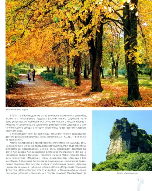 Уникальный курортный парк, один из крупнейших в Европе с десятками километров лечебных терренкуров, утопающих в роскошной южной зелени. Величественный Эльбрус и Кавказский хребет, талантливые архитекторы прошлого с любовью вписывали в этот чудесный горный ландшафт свои каменные шедевры, не нарушая, а подчеркивая и усиливая красоту природы. Мы имеем счастливую возможность любоваться ими и сейчас.