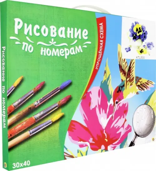 В наборе: холст (30х40 см), акриловые краски, 3 кисти, крепеж, лист для тренировки.