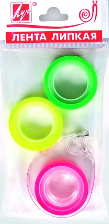 В комплекте - три ролика ленты ярких флуоресцентных цветов и диспенсер, упаковка - пакет с подвесом.