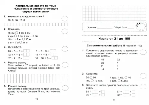 В самостоятельных и контрольных работах представлены задания различного вида и уровня сложности. Задания составлены в порядке прохождения тем в соответствии с календарно-тематическим планированием. Каждая работа включает в себя 5 заданий, направленных на проверку сформированности вычислительных навыков, умения решать задачи изученных видов, преобразования величин и умения выполнять задания геометрического содержания.