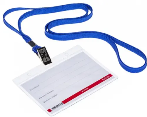 Бейдж изготовлен из плотного прозрачного пластика, представлен в горизонтальном варианте, с клипом и тесьмой.