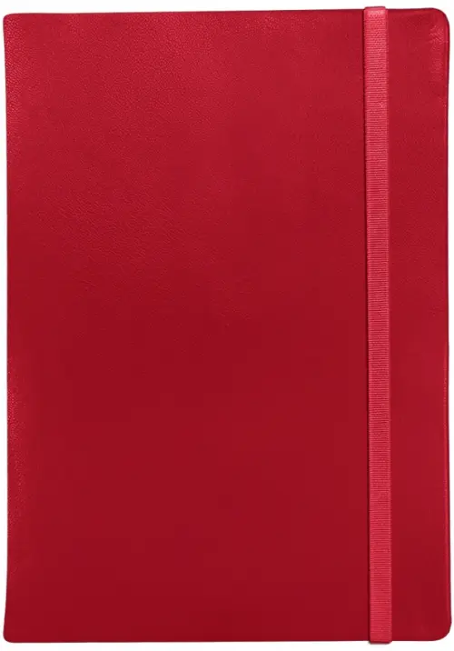 Обложка - твердая с резинкой, гладкая глянцевая искусственная кожа, цвет - красный. Блок - недатированный, 192 стр., скругленные уголки, 2 ляссе, информационный блок, бумага: цвет - слоновая кость, 70 г/м2, печать 2+2, кармашек.Особенности: вертикальная резинка