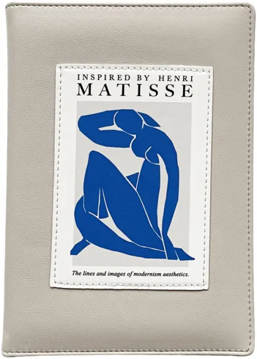 Обложка: твердая с поролоном, нежная искусственная кожа, цвет - бежевый. Блок датированный, 352 стр., скругленные уголки, 2 ляссе, информационный блок, бумага: слоновая кость, 70 г/м2, печать 2+2, кармашек. Особенности: нашивка с печатью шелкографией фрагмента картины Анри Матисса, прострочка по периметру.