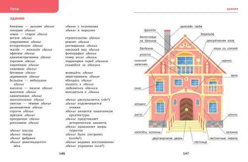 Словарь содержит более 250 словарных статей. В каждой статье приведены слова, сочетания слов и речевые конструкции, которые помогут ребёнку ясно и точно выразить свои мысли, чтобы раскрыть тему сочинения, составить устное или письменное сообщение. С помощью словаря легко подобрать нужные слова, например, для описания внешности человека, репродукций картин художников, пейзажа за окном и т. д.
