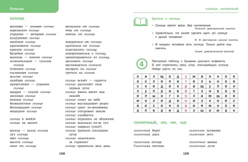 Помимо словарных статей, в словаре содержится интересная информация: стихотворения, пословицы, поговорки и народные приметы, толкования фразеологизмов и паронимов, высказывания известных людей. Также в словаре много занимательных заданий: игры со словами, кроссворды, ребусы, логические задачи и задачи на смекалку, трудные загадки и шутливые вопросы. Задания с ответами можно использовать как на уроках русского языка, так и во внеурочное время.
