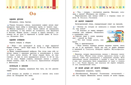 Фразеологический словарь (1-4 классы) содержит более 300 устойчивых образных выражений - фразеологизмов, в том числе входящие в обязательный для младших школьников фразеологический минимум. В словаре даются объяснения значений фразеологических оборотов, показываются Особенности употребления их в речи, раскрывается история происхождения наиболее интересных по значению единиц. В качестве иллюстративного материала используются цитаты из классических произведений детской литературы - стихотворений и рассказов В. Бианки, С. Михалкова, А. Барто, В. Драгунского, В. Голявкина, Э. Успенского и др.