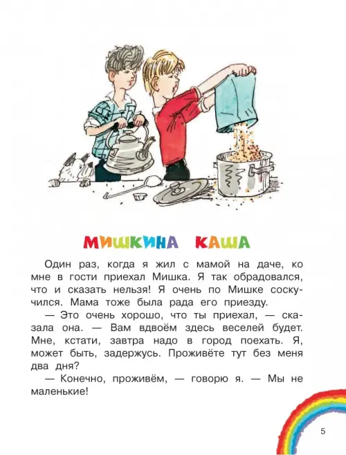 Книга "Мишкина каша" - сборник рассказов классика детской литературы Н.Н. Носова в рисунках народного художника СССР А.М. Каневского. Столько всего интересного происходит с Мишкой и его друзьями! Попробуют сварить кашу, сделать бенгальские огни и даже прокатиться на автомобиле. Не всё у ребят получается, но они учатся на своих ошибках и всегда остаются верными друзьями.