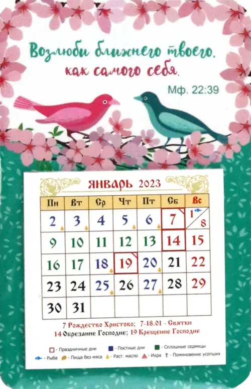 Календари 2023: просто красивые и полезныеЕсли вы обнаружили ошибку в описании товара «Магнитный календарь на 2023 год Возлюби ближнего твоего», то выделите её мышкой и нажмите Ctrl+Enter. Спасибо, что помогаете нам стать лучше!