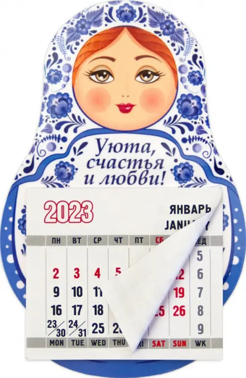 Календари 2023: просто красивые и полезныеЕсли вы обнаружили ошибку в описании товара «Магнит-матрешка с календарным блоком на 2023 год Уюта, счастья и любви», то выделите её мышкой и нажмите Ctrl+Enter. Спасибо, что помогаете нам стать лучше!