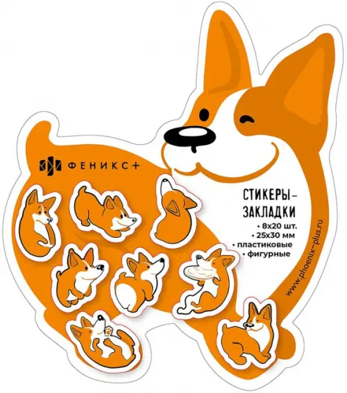 Стикеры-закладки пластиковые, 25х30 мм, 160 шт., арт. 58487 / 48 КОРГИ (материал: пластик цвет: оранжевый; кол-во цветов: 1, форма: фигурная, кол-во каждой формы:20; декор: полноцветная печать; наличие диспенсера: нет, особенности: фигурная вырубка; индивидуальная упаковка: подложка из мелованного картона + ПЭТ-пакет с европодвесом)