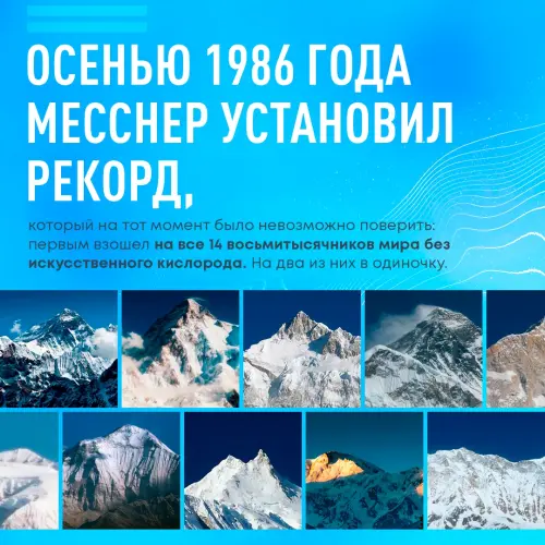 Осенью 1986 года он установил рекорд, в который на тот момент было невозможно поверить, — он первым взошел на все 14 восьмитысячников мира без искусственного кислорода, а на 2 из них в одиночку. За его плечами более 3000 восхождений, 100 первовосхождений и 70 изданных книг.