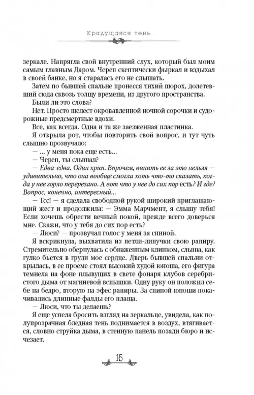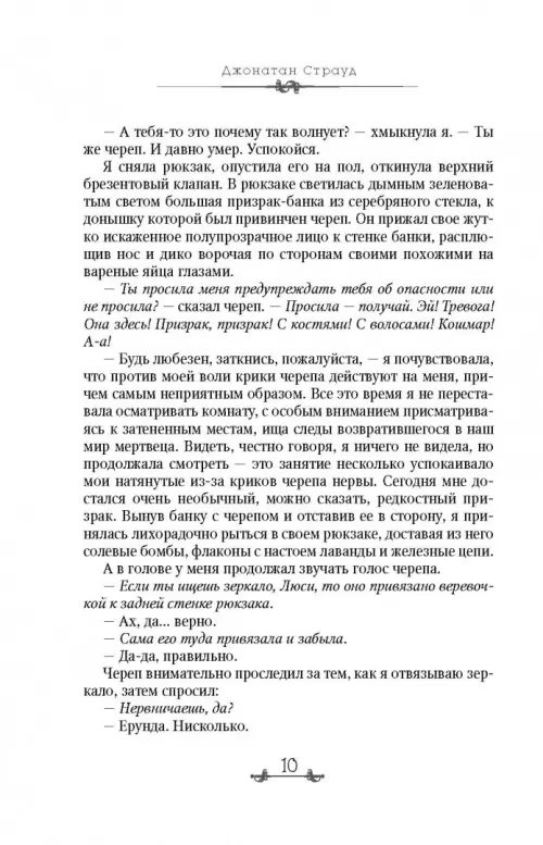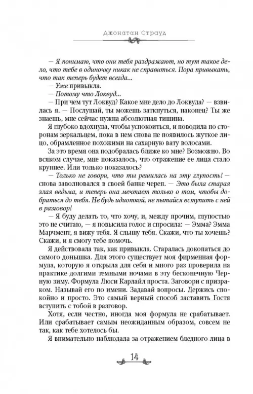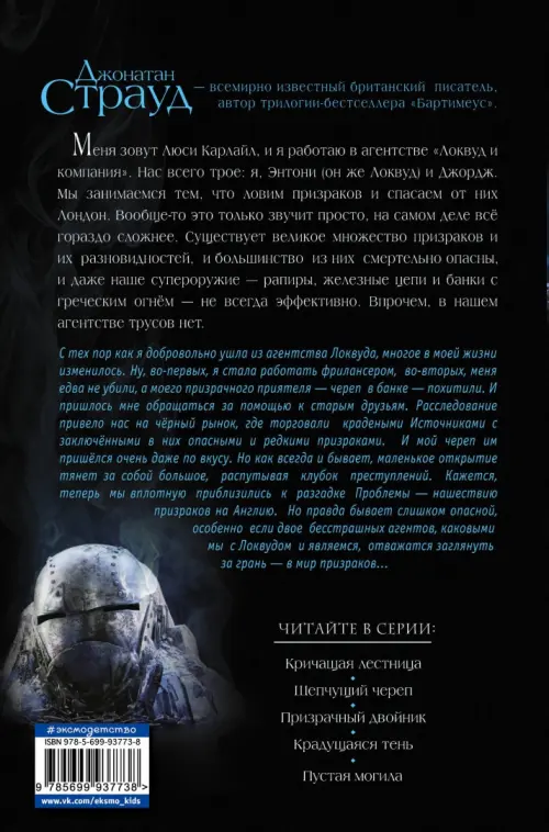 С тех пор, как я добровольно ушла из агентства Локвуда, многое в моей жизни изменилось. Ну во-первых, я стала работать фрилансером, во-вторых, меня едва не убили, а моего призрачного приятеля - череп в банке - похитили. И пришлось мне обращаться за помощью к старым друзьям. Расследование привело нас на черный рынок, где торговали крадеными Источниками с заключенными в них опасными и редкими призраками. И мой череп им пришелся очень даже по вкусу. Но как всегда и бывает, маленькое открытие тянет за собой большое, распутывая клубок преступлений. Кажется, теперь мы вплотную приблизились к разгадке Проблемы - нашествию призраков на Англию. Но правда бывает слишком опасной, особенно, если двое бесстрашных агентов, каковыми мы с Локвудом и являемся, отважатся заглянуть за грань - в мир призраков....