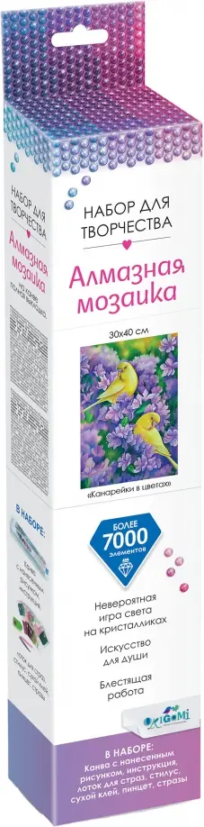 Прекрасный набор для творчества "Канарейки в цветах" от издательства "Оригами". Алмазная мозаика завоевывает все больше поклонников, это по-настоящему увлекательное и полезное хобби. Тренировка мелкой моторики, душевное равновесие, созидательная активность и практика интерьерных решений вот лишь некоторые положительные стороны э...