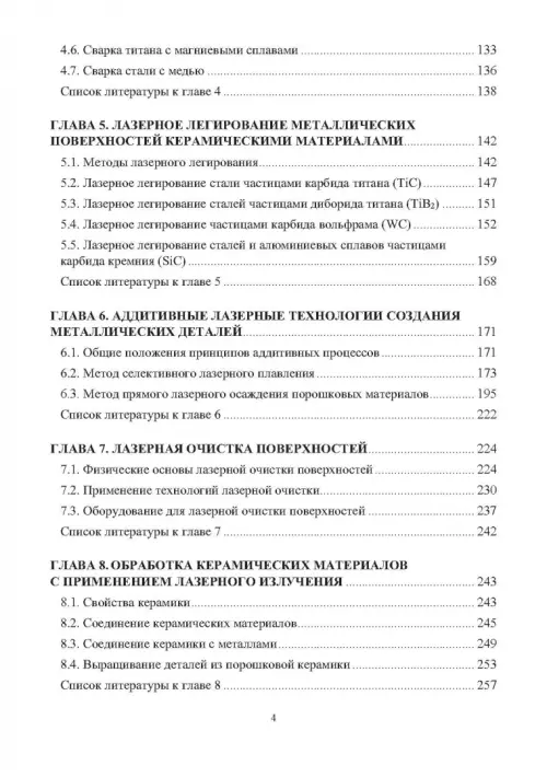 Представлены современные промышленные технологии лазерной обработки материалов мощными волоконными лазерными источниками. Рассмотрены технологии сварки больших толщин сталей и сплавов лазерами мощностью до 30 кВт, исследования их структур, механических свойств и областей применения. Особое внимание уделено сварке различных марок алюминиевых сплавов, разнородных материалов и гибридным технологиям. Даны общие представления и конкретные технологии аддитивных производств лазерного сплавления порошков и лазерной объемной порошковой наплавки. Приведены конкретные технологии и оборудование. Рассмотрены современные процессы лазерного легирования и очистки поверхностей. Даны представления о лазерной безопасности и средствам защиты при использовании лазерных технологий.