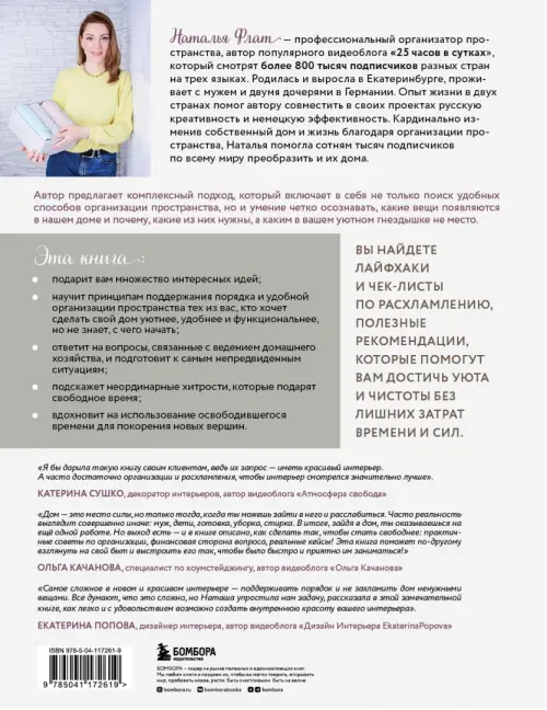Автор этой книги Наталья Флат — известный видеоблогер об организации пространства «25 часов в сутках», по ее видеоинструкциям организовали свои дома сотни тысяч зрителей, ее советы по домоводству цитируют телеканалы нескольких стран, а крупные бренды приглашают к сотрудничеству и предлагают протестировать их товары для чистоты и порядка в доме.