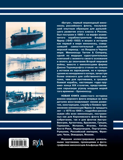 НОВАЯ КНИГА известного историка военно-морского флота впервые во всех деталях восстанавливает линию развития, конструкцию, службу и боевое применение миноносцев Ярроу за тридцать лет — с 1875 по 1905 г., подробно рассказывая обо всех миноносцах, построенных как для Королевского флота Великобритании, так и для флотов Австро-Венгрии, Аргентины, Бразилии, Греции, Германии, Испании, Италии, Китая, Коста-Рики, Нидерландов, Португалии, Румынии, Российской Империи, Франции, Чили, Эквадора, Японии.
