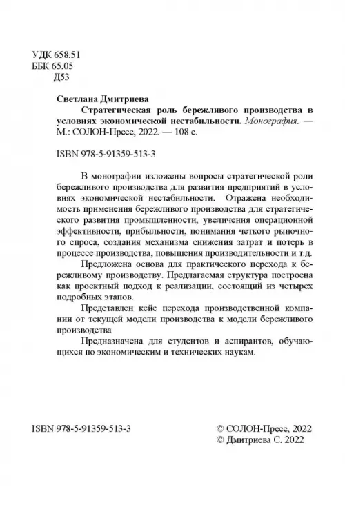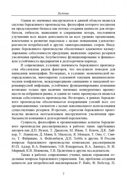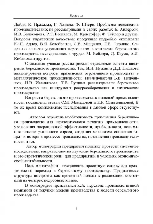В монографии изложены вопросы стратегической роли бережливого производства для развития предприятий в условиях экономической нестабильности. Отражена необходимость применения бережливого производства для стратегического развития промышленности, увеличения операционной эффективности, прибыльности, понимания четкого рыночного спроса, создания механизма снижения затрат и потерь в процессе производства, повышения производительности и т.д.