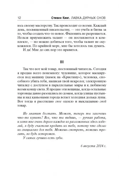 Автор многочисленных романов, Стивен Кинг всегда считался еще и блестящим мастером малой прозы, ведь именно эти произведения принесли ему престижную премию О. Генри. Новый сборник рассказов Кинга "Лавка дурных снов" - книга уникальная. Мастер впервые предваряет каждое произведение удивительно откровенной историей его создания, приоткрывая "дверь" в свою творческую мастерскую. Захватывающие и пугающие, будоражащие воображение и предостерегающие, эти рассказы - маленькие шедевры, которые мог написать только великий Стивен Кинг. "Я создал их специально для тебя, - обращается писатель к своему читателю. - Можешь смотреть, можешь трогать, но будь осторожен. У самых лучших есть зубы."