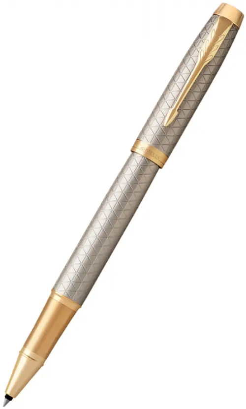 Ручка-роллер "Parker IM Premium Warm Silver GT". Линия письма - тонкая, цвет чернил черный, в подарочной упаковке. Произведено в Китае.