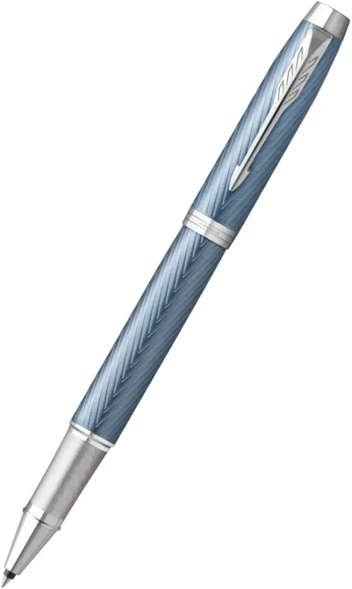 Ручка-роллер "Parker IM Premium Blue Grey CT". Линия письма – тонкая, цвет чернил – черный, в подарочной упаковке. Произведено в Китае.