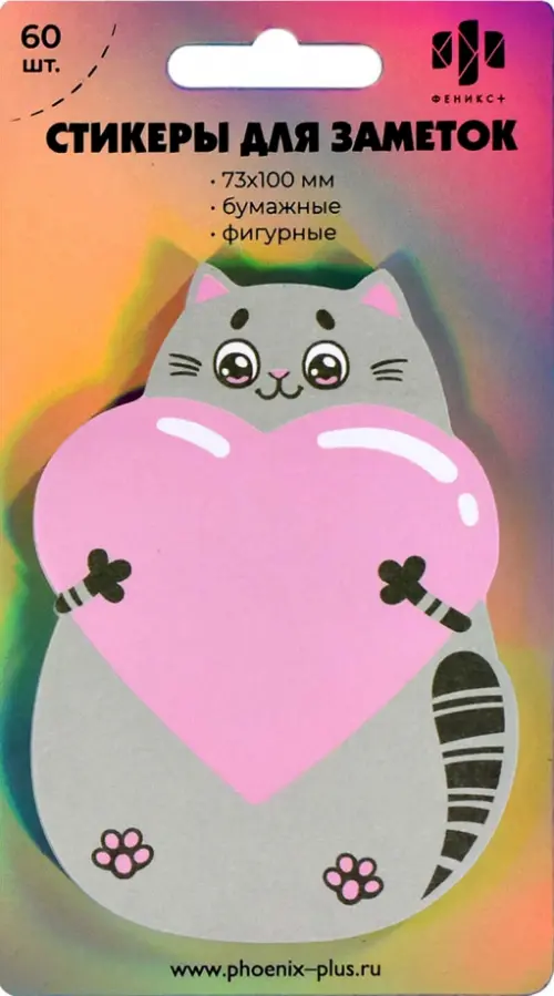 Стикеры для заметок бумажные, 73х100 мм, 60 шт., арт. 58555 / 25 КОТИК (материал: бумага 80 г/м?, цвет: серый, розовый; кол-во листов: 60 л., форма: фигурная, декор: полноцветная печать, фигурная вырубка; наличие диспенсера: нет, индивидуальная упаковка: подложка с европодвесом из голографического картона + ПЭТ-пакет)