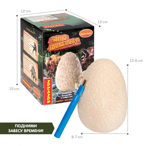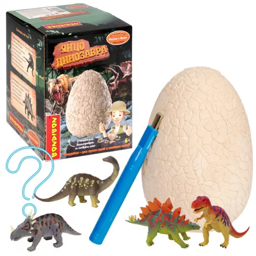 В комплекте: яйцо для проведения раскопок, инструмент для раскопок, части пазла динозавра внутри гипсового блока, инструкция.