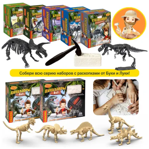 Представьте себя палеонтологом и займитесь раскопками скелета древнего ящера прямо дома. Вы может попасться один из 4 разных динозавров - диплодок, трицератопс, тираннозавр или стегозавр.