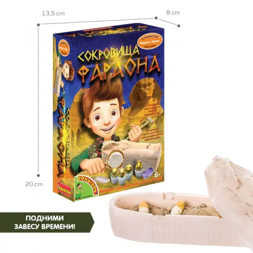 Нет ничего прекраснее, чем окунуться с головой в тайны, которые может рассказать история человечества. Этот набор представляет собой саркофаг фараона, в котором хранятся уникальные сокровища! Достань эти сокровища, используя археологические инструменты. Для этого нужно будет сбить запоры-иероглифы, которые прикрепляют крышку саркофага. Приложи усилия, воспользуйся долотом и молотком и найди загадочные сокровища фараона! Игра с этим набором поможет развить внимание к деталям, мелкую моторику, когнитивные навыки.