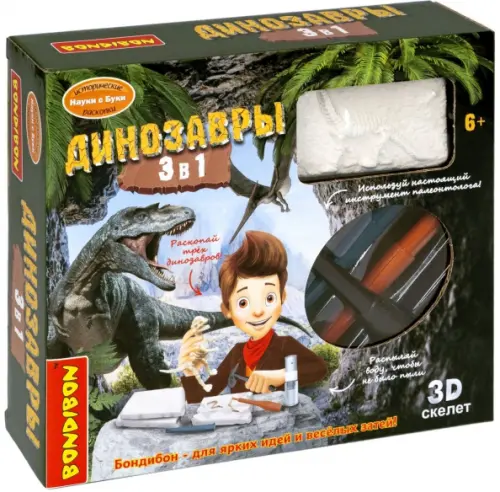 В комплекте: 3 блока для проведения раскопок, молоток, зубило, пузырек с пульверизатором, скелеты 3 динозавров внутри гипсовых блоков.