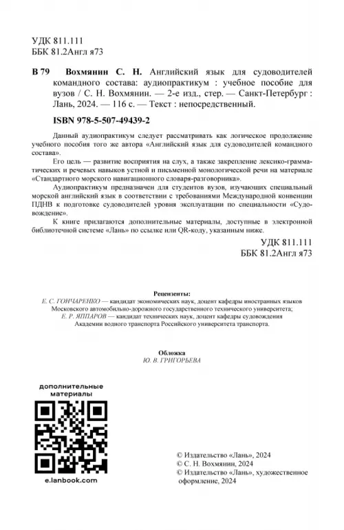 Если вы обнаружили ошибку в описании товара «Английский язык для судоводительского командного состава. Аудиопрактикум» (авторы: Вохмянин Сергей Николаевич), то выделите её мышкой и нажмите Ctrl+Enter. Спасибо, что помогаете нам стать лучше!
