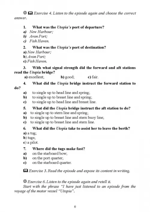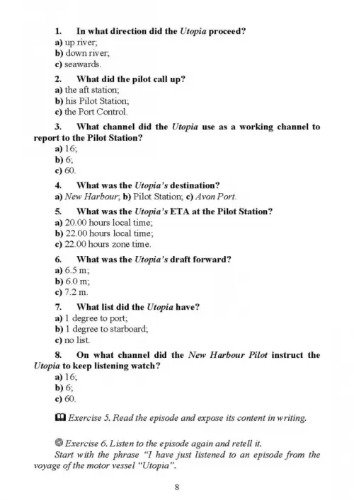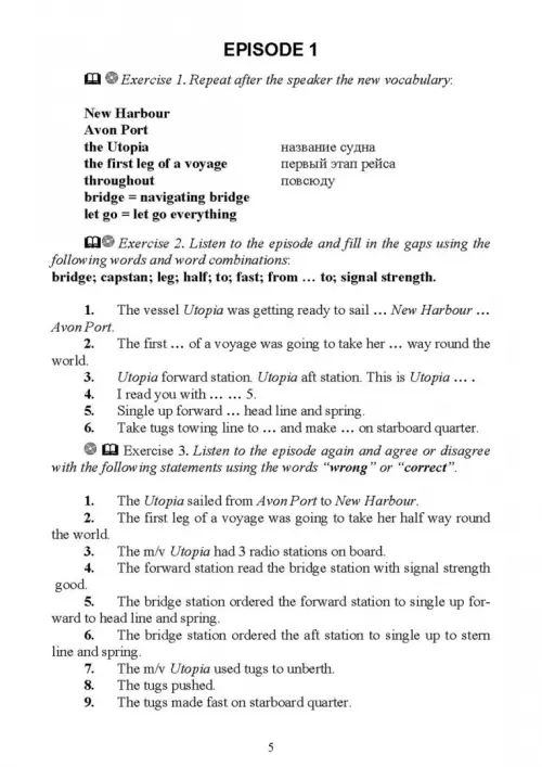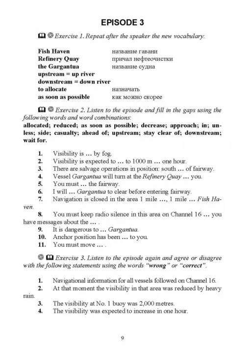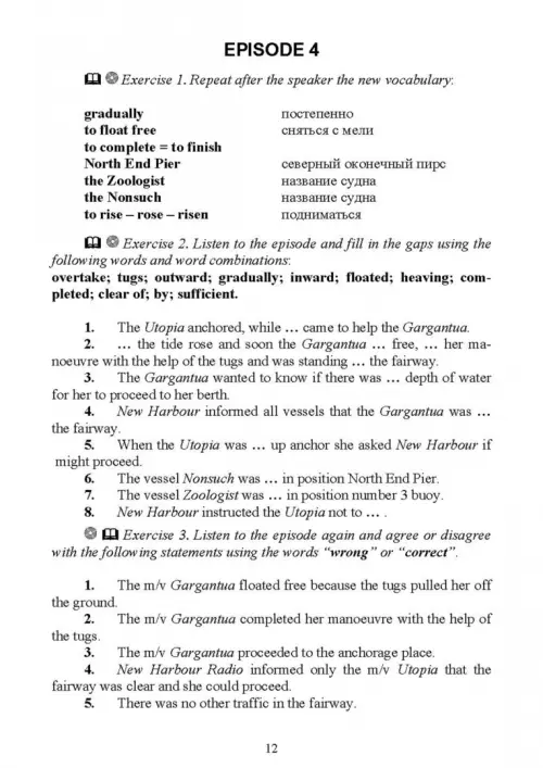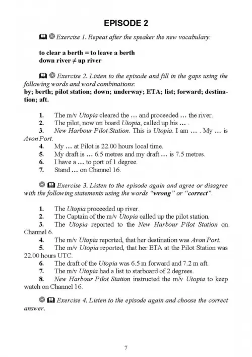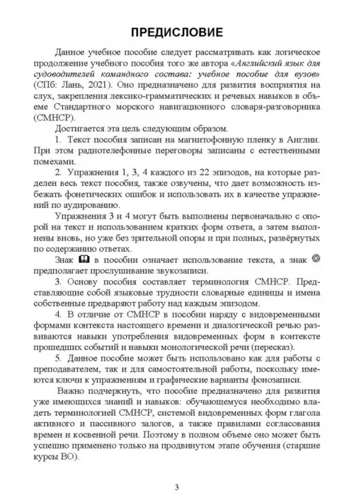 Его цель - развитие восприятия на слух, а также закрепление лексико-грамматических и речевых навыков устной и письменной монологической речи на материале "Стандартного морского навигационного словаря-разговорника".