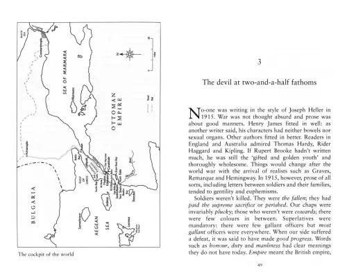 'Because it was fought so close to his old home ground, Homer might have seen this war on the Gallipoli Peninsula as an epic. Brief by his standards, but essentially heroic. Shakespeare might have seen it as a tragedy with splendid bit-parts for buffoons and brigands and lots of graveyard scenes. Those thigh bones you occasionally see rearing out of the yellow earth of Gully ravine, snapped open so that they look like pumice, belong to a generation of young men who on this peninsula first lost their innocence and then their lives, and maybe something else as well...'