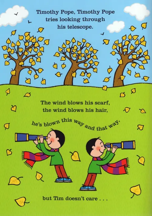 Timothy Pope is blown this way and that way in the windy park -- but among the whistling wind and blustering brollies could that be a shark he spies through his telescope. Peep through the die-cut hole in the pages of the book to find out.